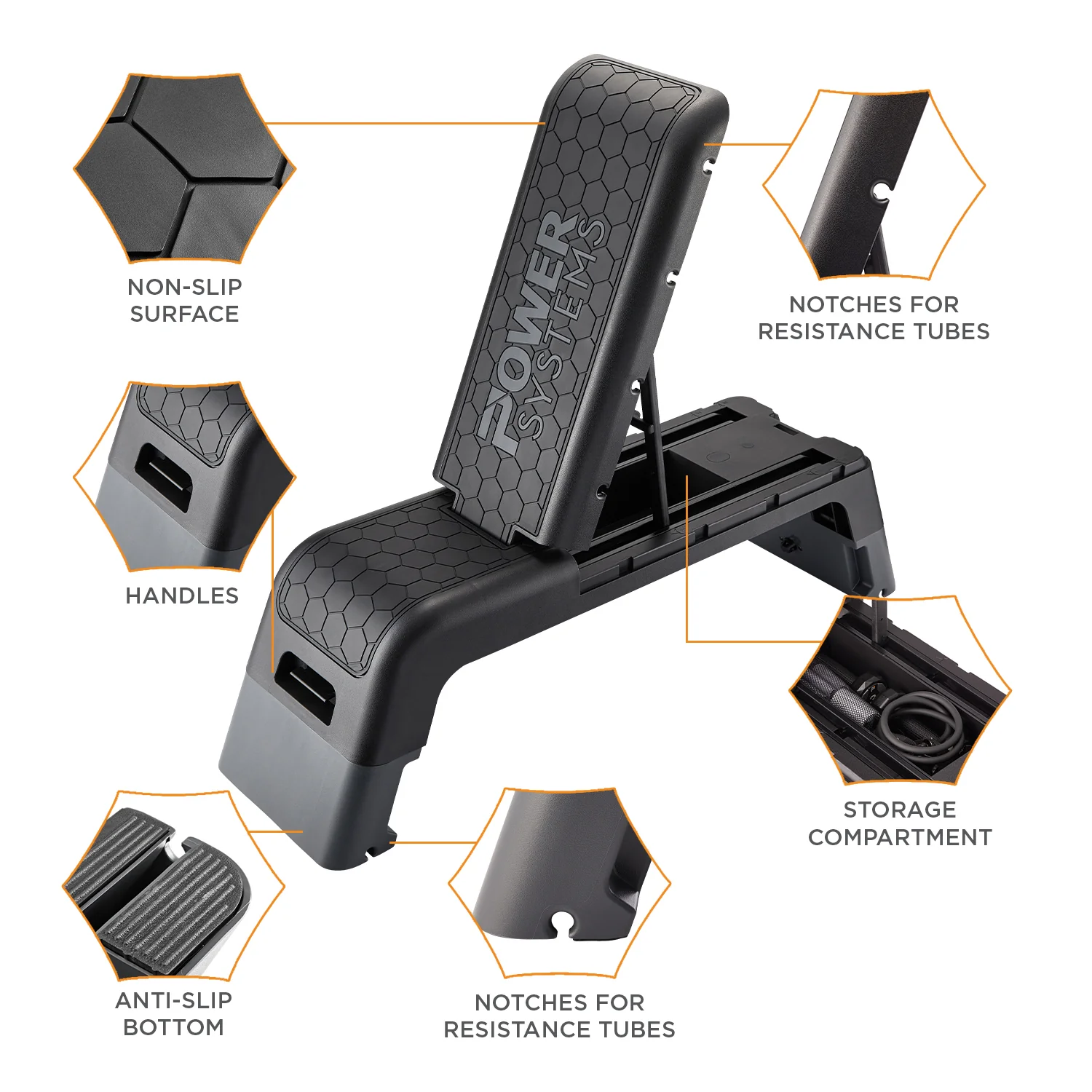 Turn any corner of your home into a true training zone with the Power Systems Deck. This clever 2-in-1 step and bench gives you studio-style versatility without the bulky gear: choose 8″ or 14″ height for low-impact step, HIIT, or plyo work, then flip to flat, incline, or decline for strength moves like presses, rows, dips, and core. The updated, grippy top keeps you planted when the pace picks up, while integrated tube clips make band workouts clean and simple. When you’re done, stash bands or small accessories in the internal compartment and slide the deck out of the way—no visual clutter left behind. At 48″ x 13″ with a 330-lb user capacity, it’s compact, sturdy, and ready to grow with your routine from beginner to beast mode. One piece. Endless workouts. Minimal space.