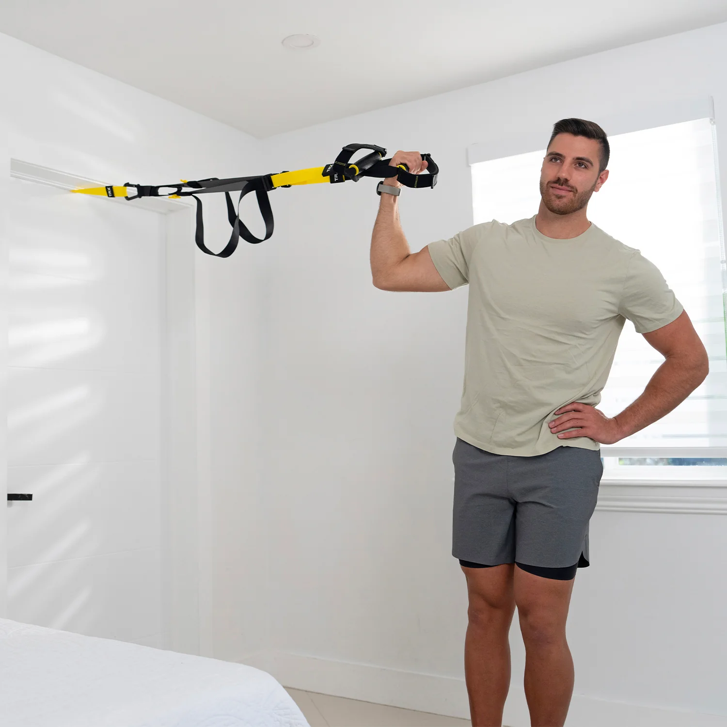 TRX straps should be anchored a distance of 7 ft. – 9 ft. from the floor – to a door frame, wall mount, or rig frame. Each strap should have clearance for the user of 3 ft. left and right, and 5 ft. behind. For ideal usage, the locking carabiner of the strap should be situated 6 ft. – 6’2″ from the ground.